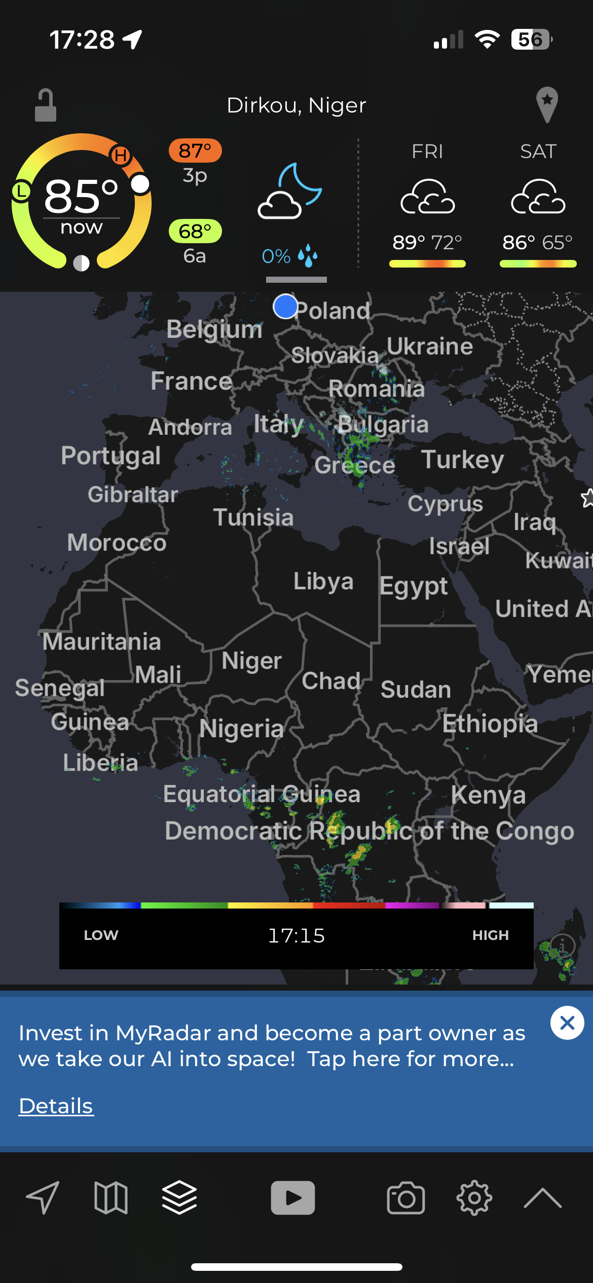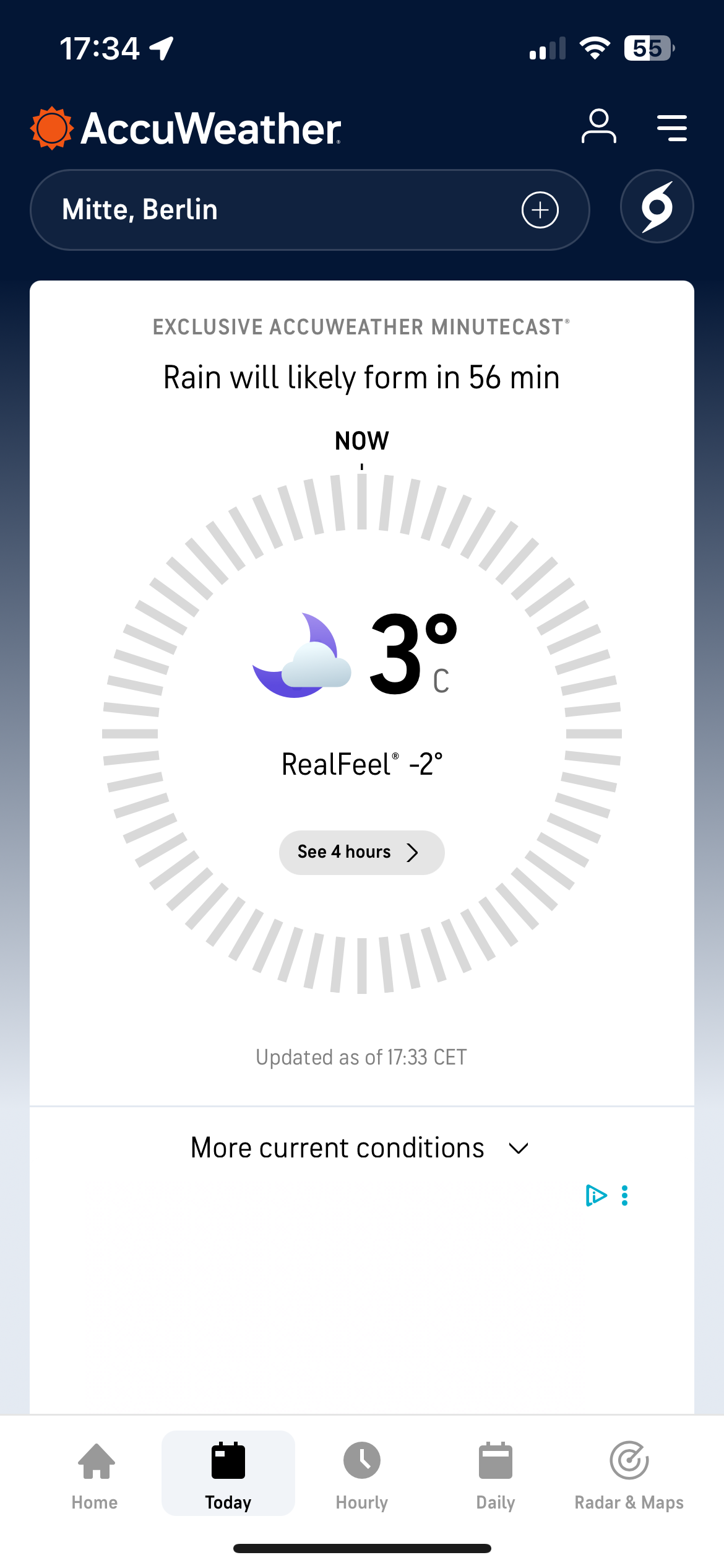 • Radar options, future cast layers, precipitation type, wind direction and temperature details