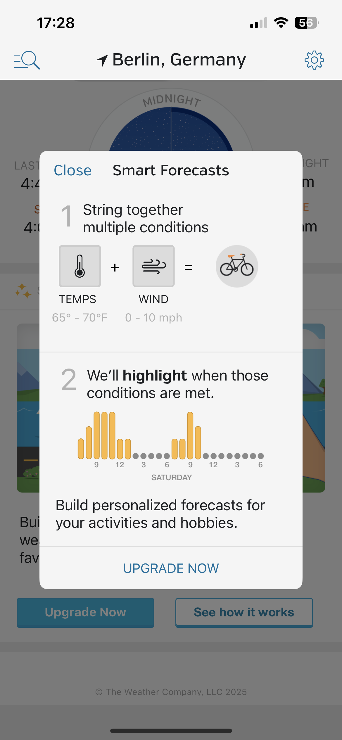 • The paid version lets you create personalised “smart forecast” combinations based on hobbies or activities. For example, you can set ideal temperature and wind conditions to see when it is a good day for cycling, running or gardening.