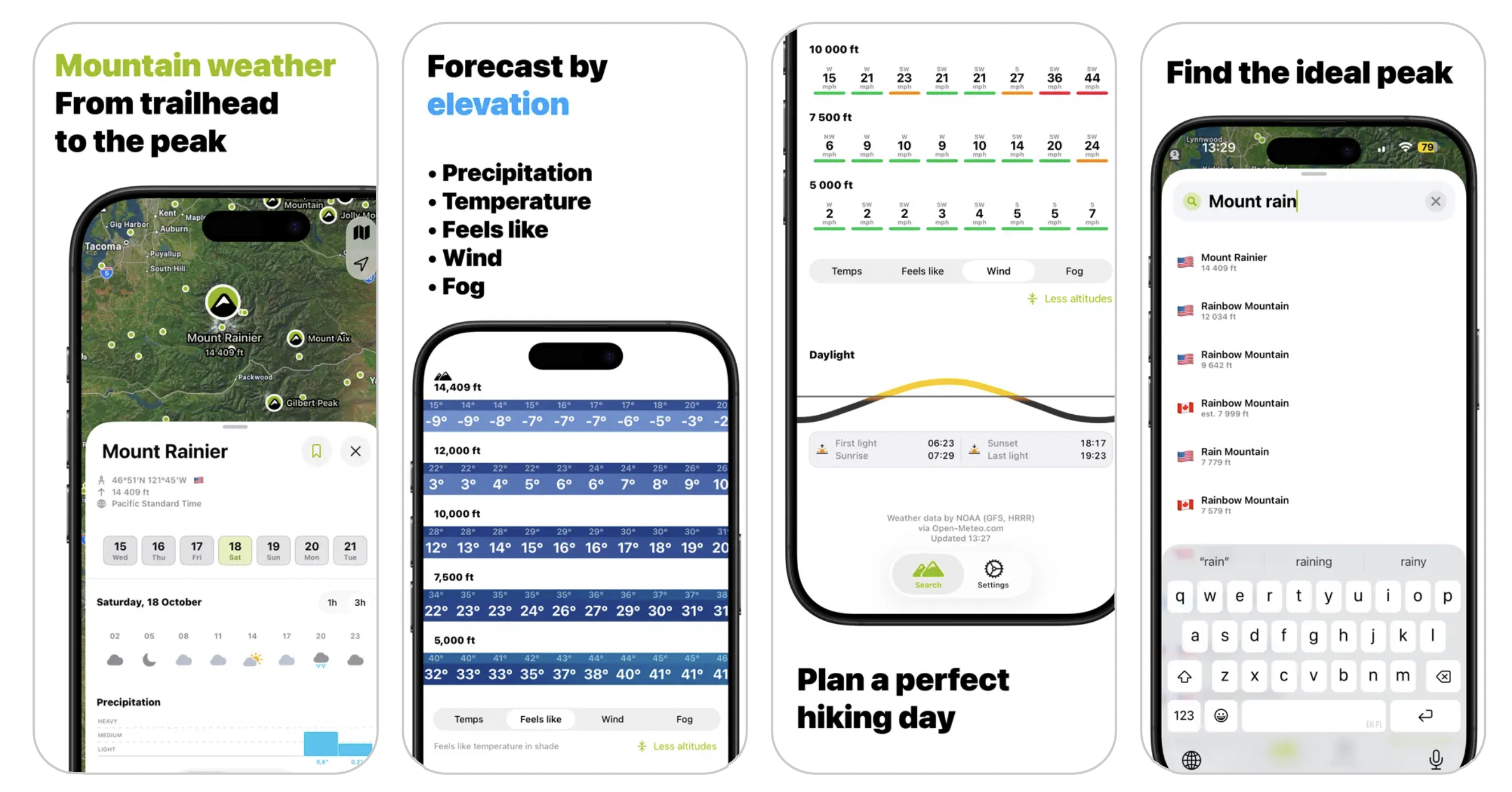 Elevation-Based Forecasts Instead of a single reading for a location, Peak Weather shows you how temperature, wind, precipitation, and visibility change as you climb. That means you get useful, accurate information for the specific altitude you'll be hiking through not an averaged-out city forecast from the valley floor.