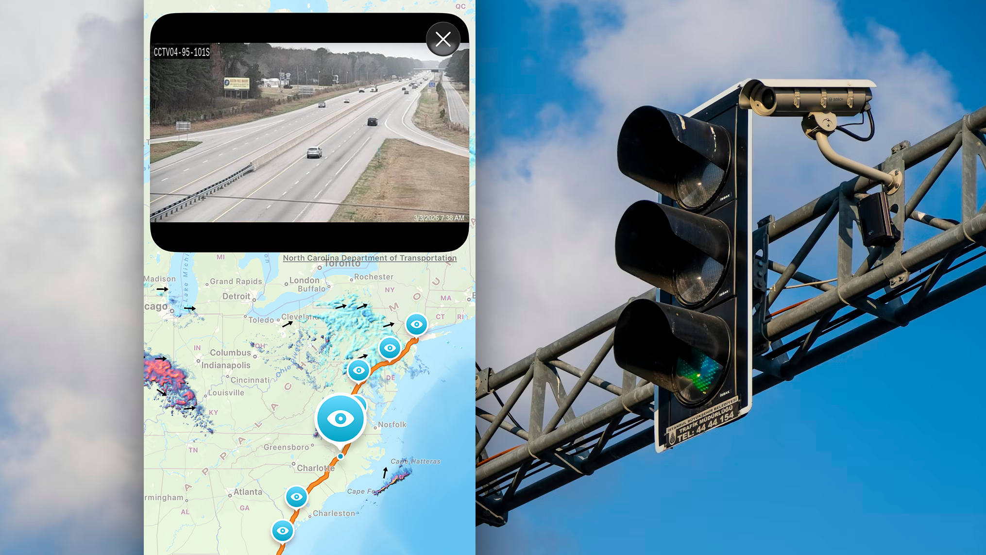 We've added live traffic camera feeds, sourced directly from DOT and highway authority networks across the US, right onto your route map.